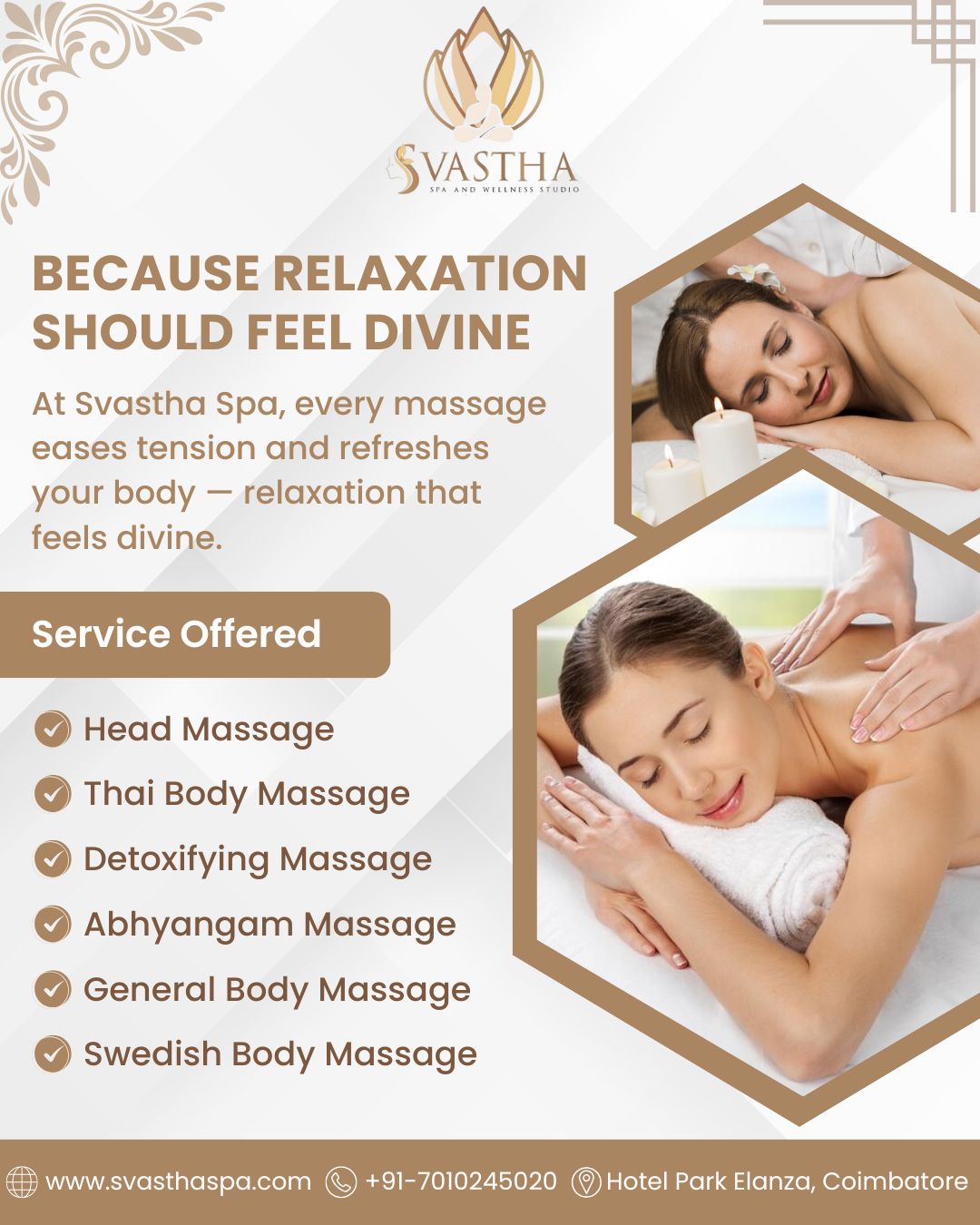 Relaxation isn’t just about taking a break — it’s about awakening your senses and finding deep calm. At Svastha Spa and Wellness Studio, a serene Coimbatore spa hotel, every touch and every breath lead you toward pure bliss where your mind unwinds, your body feels lighter, and peace gently takes over. Because true relaxation should feel nothing less than divine.